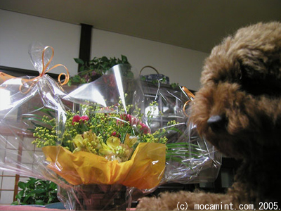 モカの出産祝いにブンちゃん、マコちゃん、ヨッちゃんから花をいただきました。ありがとう。