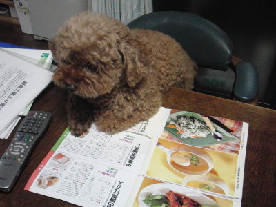 お孫くんが 保育園から帰って来て おやつを食べてます。 モカも 欲しいけど ぐっとがまん がまん。でも 段々 体が乗り出してきてます。 結局 貰えないし ダイエット中なので 料理の本を見て 気を紛らすことにしました。 でも わたしも おやつ欲しいなあ。視線は お孫くんの方へ 向いてます。