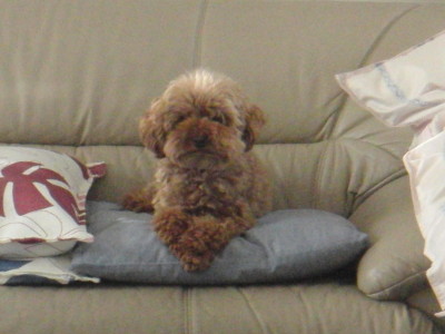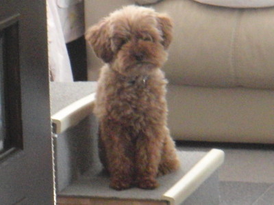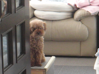 掃除機をかけ始めると モルトは遠くに避難します。男の子なのに 4頭の中で 1番の弱虫です。それでも 視線はママから離れません。掃除機を止めると 即 近寄ってきます。 再び 避難中の場面 モカの体重 6.6キログラム [:ぎょ:] どうして[:がーん:]