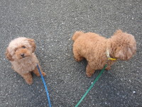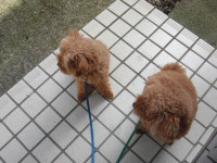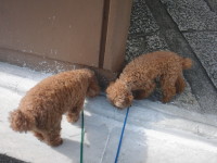 散歩に出かける前に おすわりをします。 モルトが興奮して キイキイいうので 少しクールダウンさせます。 親子で臭いかぎしてます。 させたくない行為なんですが。 散歩終了。玄関に入る前の待てです。 だいぶ上手になりました。