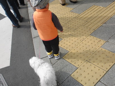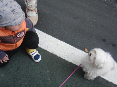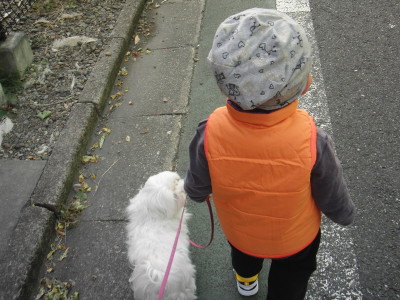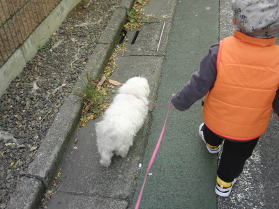 モカとカシュカシュの帰宅後 ミントとモルトを散歩に連れ出しました。お孫くんも一緒です。ミントのリードをお孫くんが持ってます。するとミントは とってもおりこうにお孫くんの後からついていってます。 いつもと違ってとってもお散歩上手です。 ちゃーんと横にもついて歩いてます。 どう 私 いい子でしょ。 いつもおやつを 分けてくれるお孫くんを ミントは大好きです。[:love:] 歩くの遅くて 今日の散歩はつまらなーいと モルトは不満です。