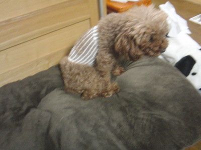 カシュカシュの抜糸まで後2日。しかし とうとう手術後に貼ってあったテープが剥がれてしまいました。薬局で滅菌ガーゼとネット包帯を買ってきて 救急処置。カッちゃん もう少しの辛抱だね。 情けない表情のカシュカシュです。