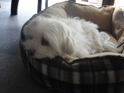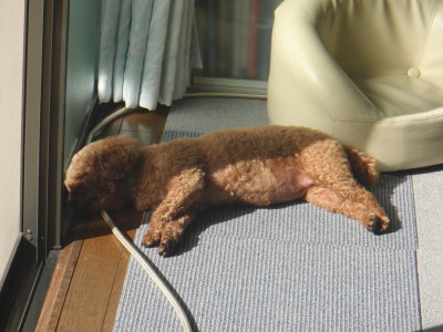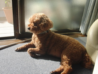 [:○:][:○:]犬と一緒 この子はいったい誰? 髪がのびてしまって カシュだかモルトだか こうしてると いっこうに わかりません。 顔をあげてみると カシュカシュでした。 午後になって 晴れて暖かくなりました。例によって みんなで日向ぼっこです。 モカ ミント