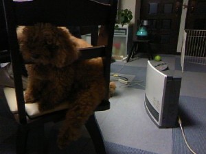 とっても窮屈そう 片足が 椅子からはみ出してます。
