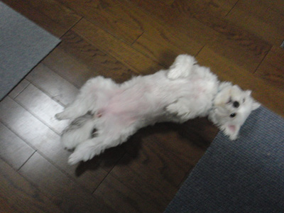 近頃はミントもこのかっこうで眠ることが多くなってきました。暑さのためなかなか散歩に行けないので運動不足に。 従って背中にお肉がついてこのかっこうができるように。 なので涼しくなったらみんなでダイエットです。