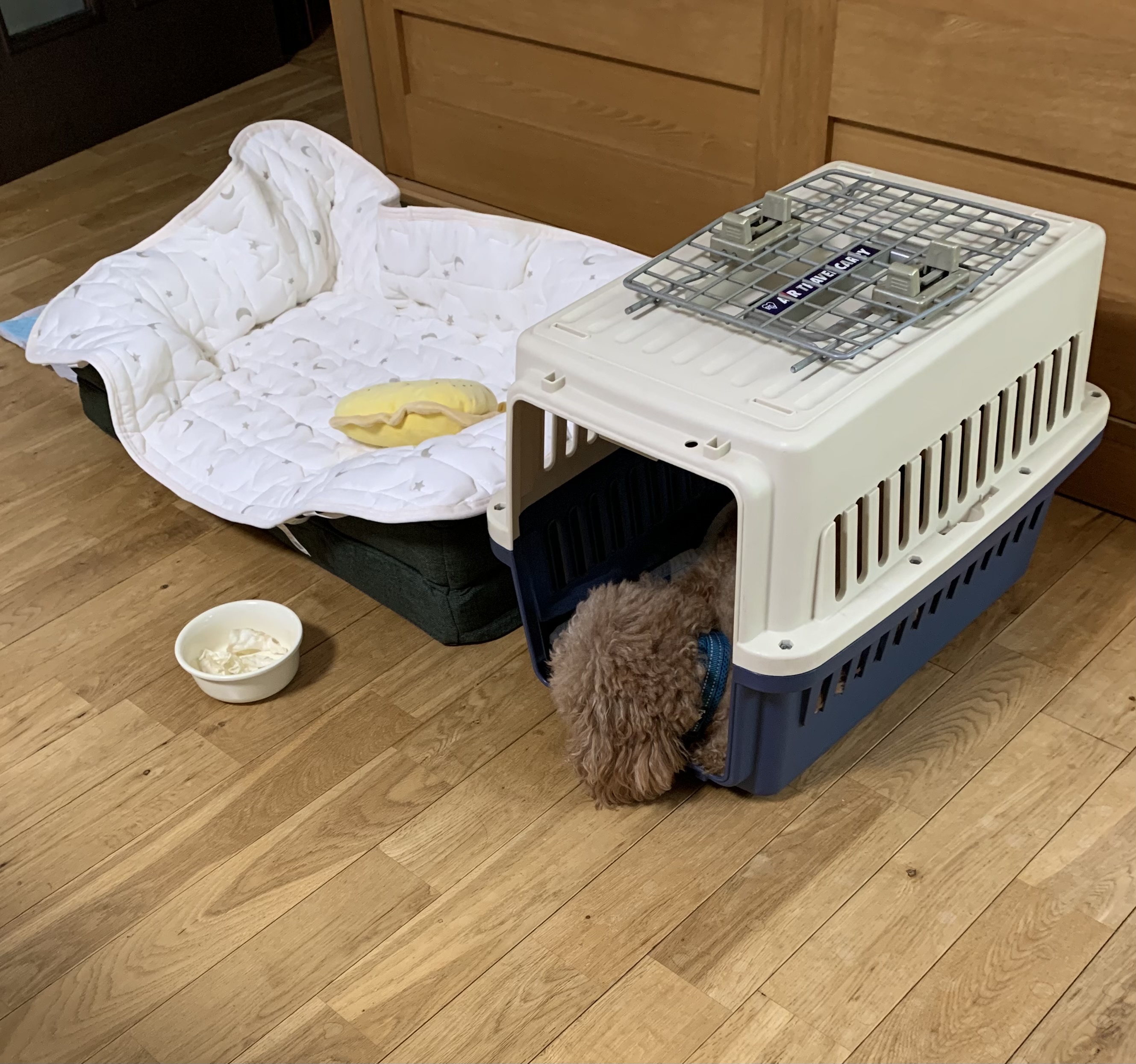 珍しく 花ちゃんは クレートで 落ち着いてます
