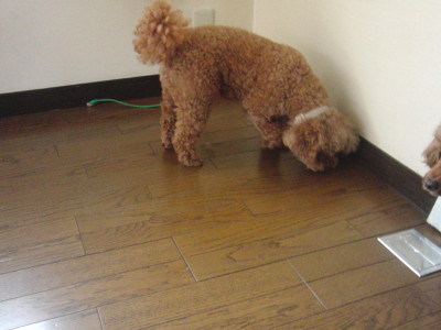 この時点では 吠えずに待ってられますが ママが外に出ようと 玄関ドアを開けようものなら