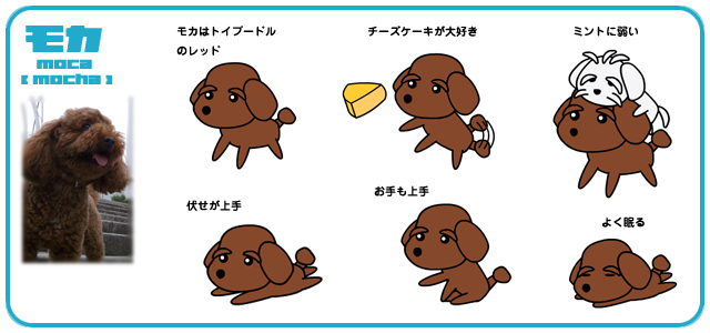 モカ(Moca)はトイプードルのレッド。2002年8月30日生まれの女の子。気が優しく散歩にいっても誰とでもすぐに仲良くなり、すぐにおなかを見せます。2005年10月6日に4匹のかわいい子供たちのお母さんになりました。2匹の子供は今は独立しました More »
